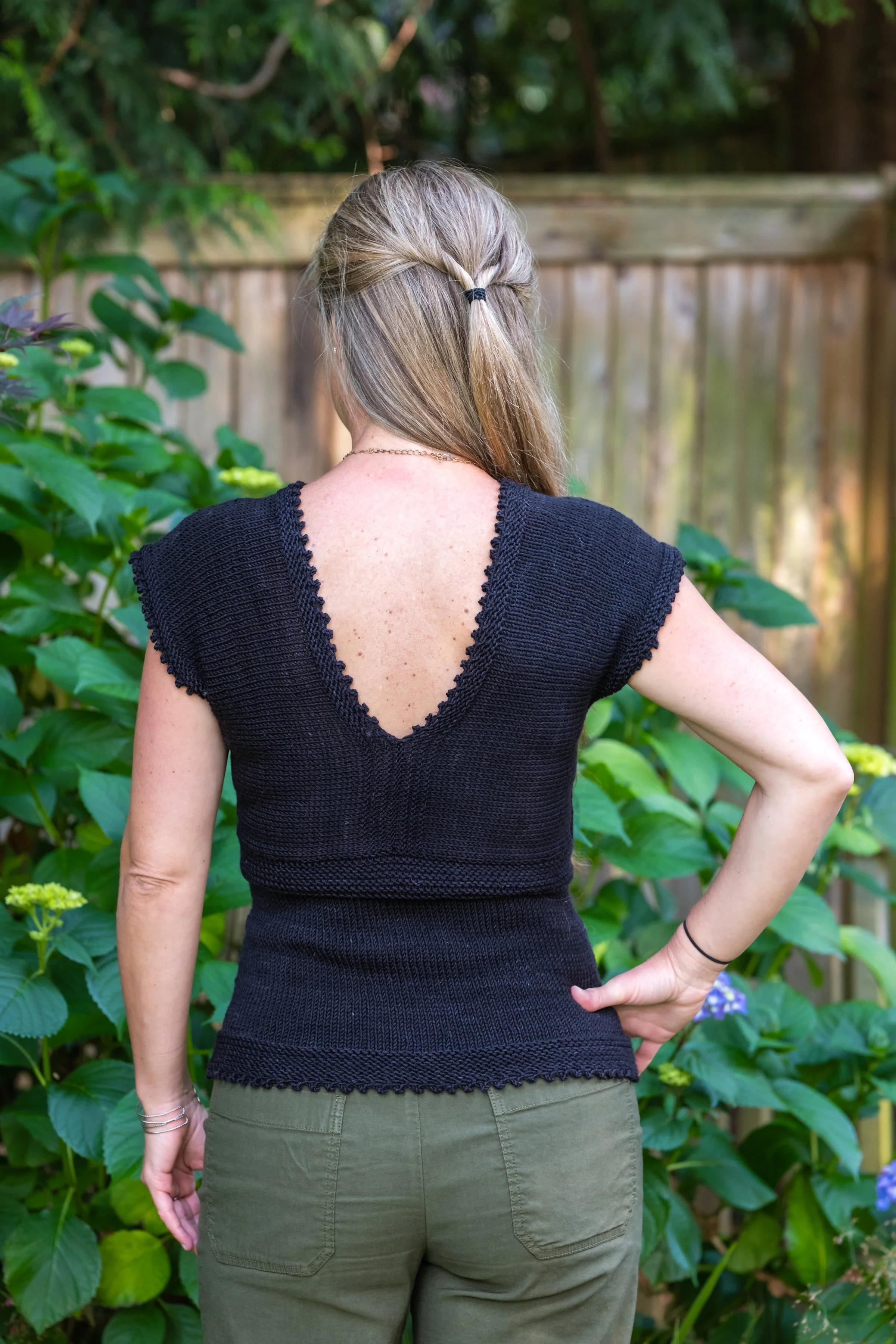 The Mexico Shell is a fun and flattening top to knit and wear. This top is made in three pieces. The bottom portion is knit in the round from the bottom up. The top is made with two rectangular pieces that are knit flat and then sewn to the front and back of the bottom piece.
